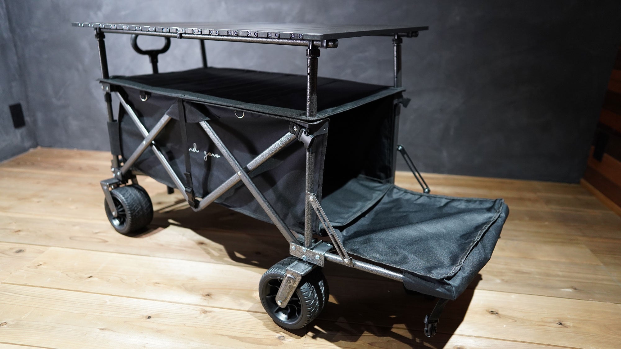 食材や道具を運ぶだけじゃなく、ワゴン自体をテーブルにしたい。日差しや雨から荷物を守ってくれるフタも欲しい。そんな多くのご要望にお応えして、オールインワンの改良版アウトドアワゴンが誕生しました。