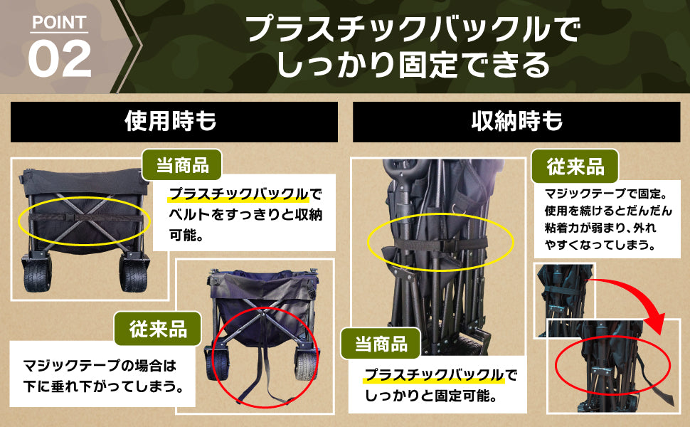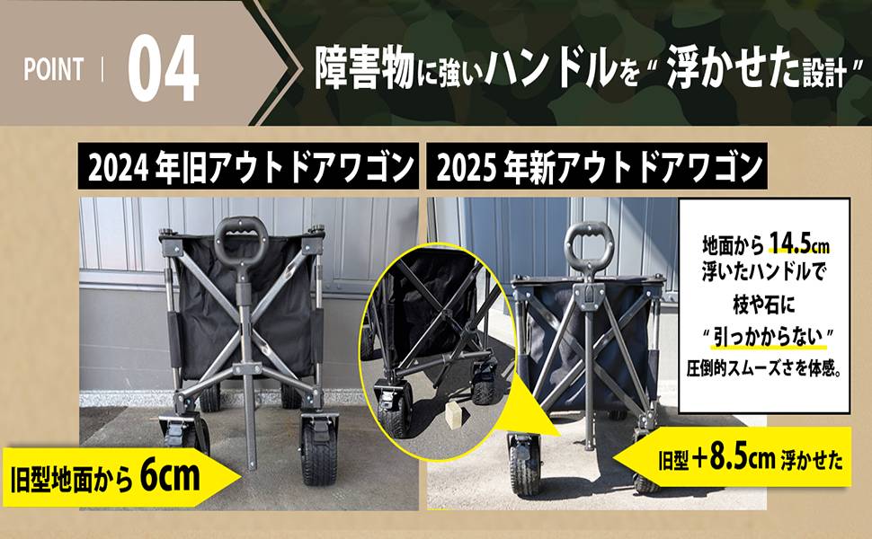 - ✅【ポイント】 ✔ 後方オープン設計 → 長尺物の積載が簡単!焚き火用の薪やフィッシングギアもまとめて運べる。 ✔ ワンタッチでハンドル高さを変更(56.5cm~87cm) → どんな体格の方でも快適に操作可能。 ✔ 自由な角度調整(最大67.6度まで調整可能) → 繊細なコントロールが可能。 ✔ 収納時も引いて移動可能 → 車載時もスムーズ。狭いスペースでも楽々持ち運び! ✔ 超ワイドタイヤ(幅10cm) → 砂利道・砂浜・悪路もスムーズ! ✔ 前輪360°回転キャスター & ワンプッシュブレーキ → 操作性と安全性を両立!斜面でも安心して使用可能。 ✔ 側面取り外し可能 & 収納カバー付き → 衛生的に使え、アウトドアシーンでも常に清潔をキープ。